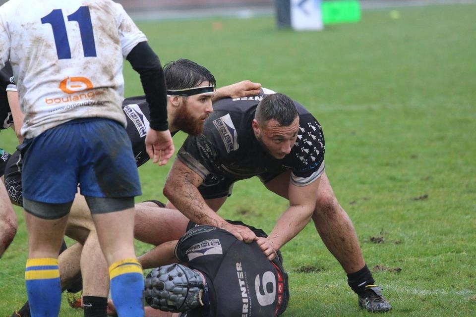 Valentin Boucherie au ruck face à l'Olympique Marcquois (à gauche, Maxime Brilland)