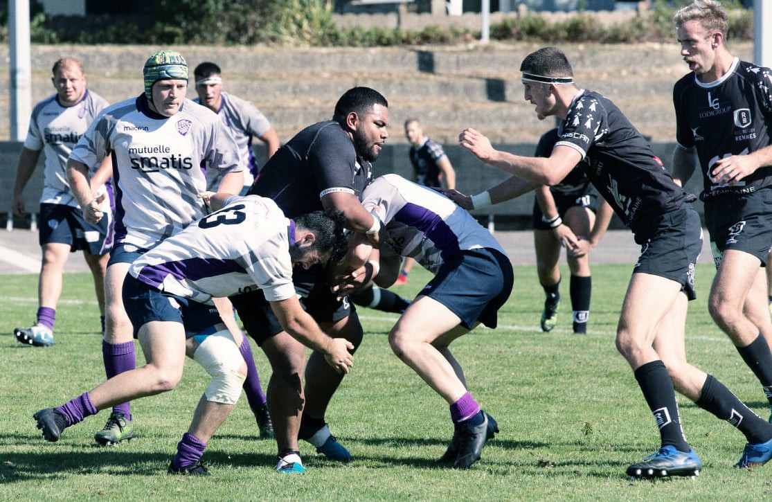 Tuikalepa, ballon en main, face au SA XV, Thomas-Guénée et Sigogneau au soutien
