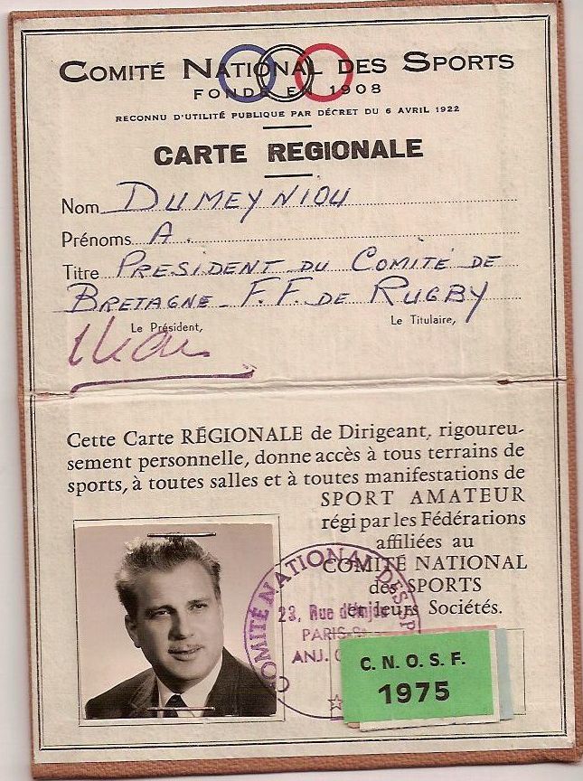 Carte de dirigeant national du rugby breton de Alain Dumeyniou éditée par le CNS
