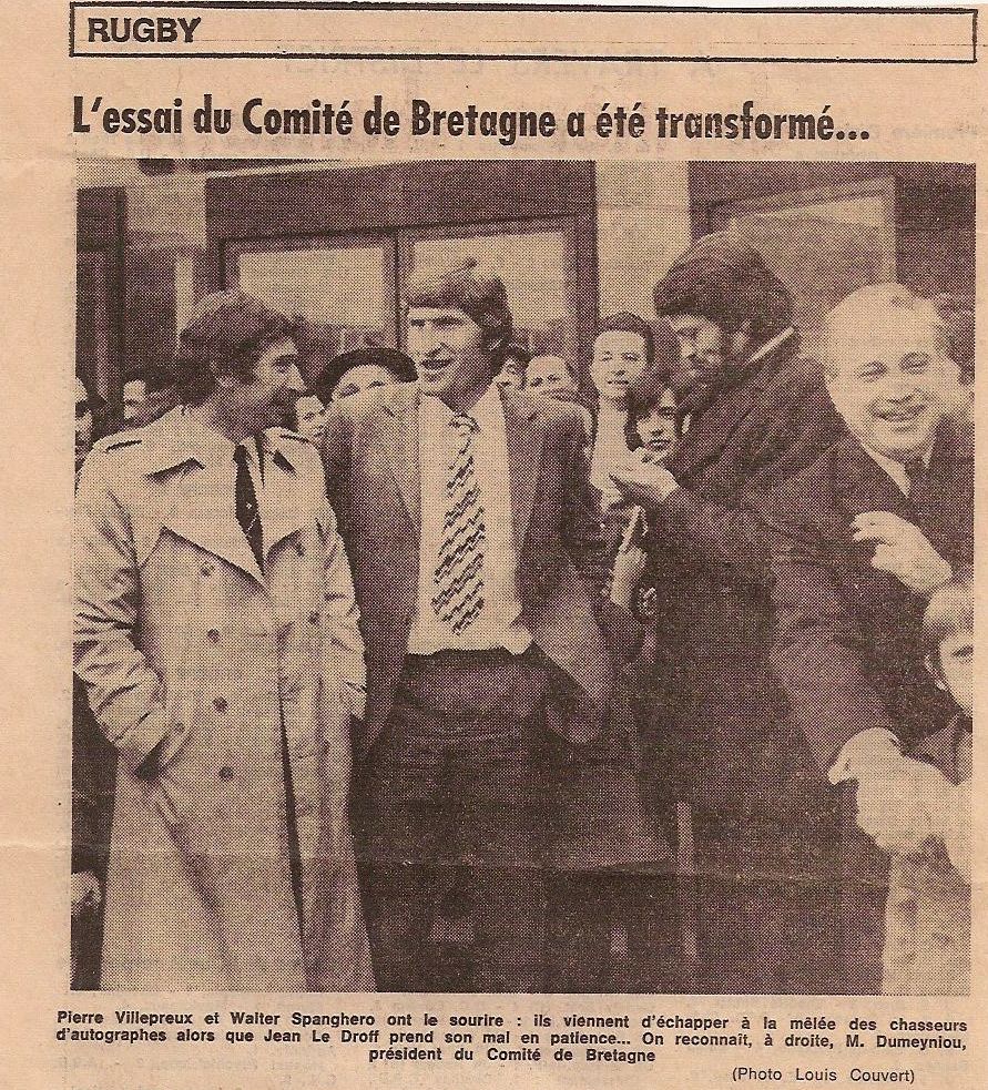 Alain Dumeyniou à droite 1er Président du REC et Président du Comité régional de Bretagne de rugby, lors de la venue de Pierre Villepreu et Walter Spanghero à Rennes en 1968.