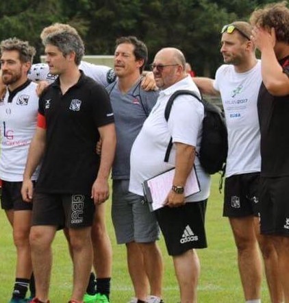 Gabriel Brousse entouré par Thomas Mottin, Kevin Courties, Yoann Carnot, Chris Walker, Maximilano Cocetta et un entraîneur de Jersey lors du match amical, à Dinan, face aux Anglais