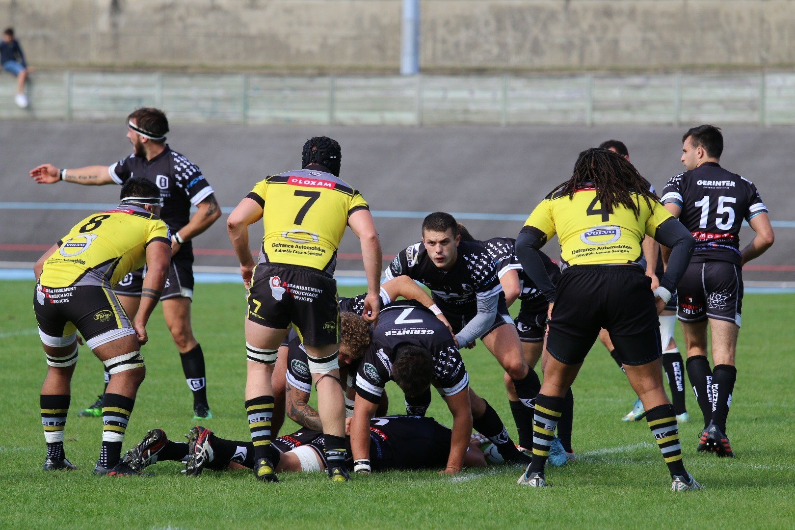 Les Rennais vont tenter de se dégager, Noé Cayot protège le ballon aux côtés de Chris Walker et Lilian Caillet